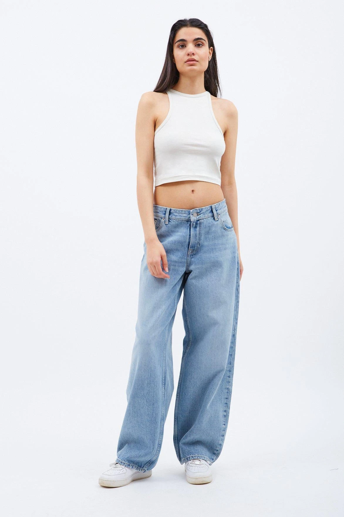 Relaxed low-rise fit with a wide straight leg. The hem is nipped in slightly to make it sit nicely on your shoes. Size up the inseam for added stacking. Made from 100% cotton denim fabric.